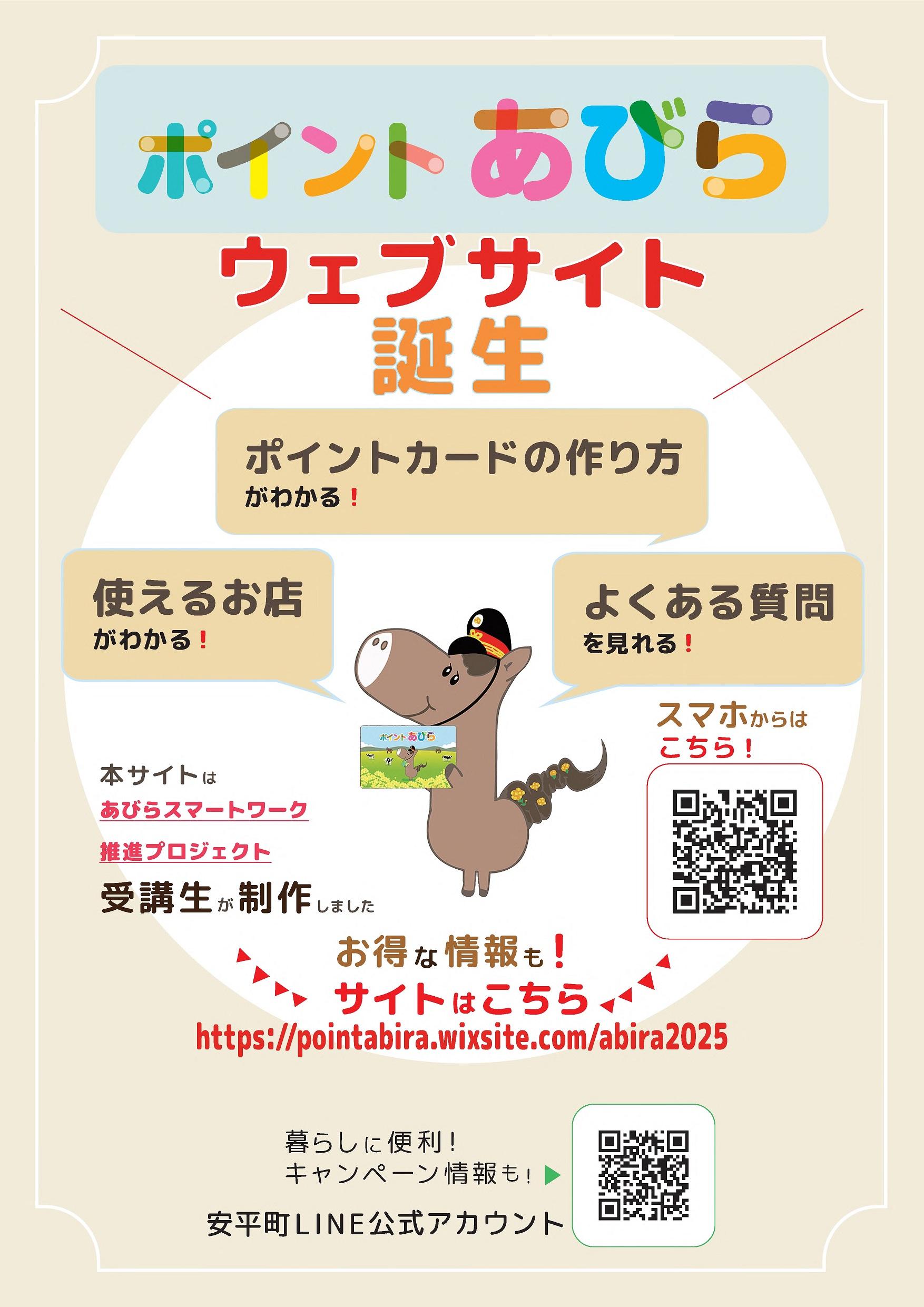 この作品は、短期プログラム受講生(第2期生)が「あびらスマートワーク推進プロジェクト」における「短期プログラム3期生募集の告知」をテーマとして制作したものです。企画検討から始まり、デザイン制作まで全てをワンストップで実施しました。また、道の駅あびらD51ステーションSNSのPOPも制作頂きました。