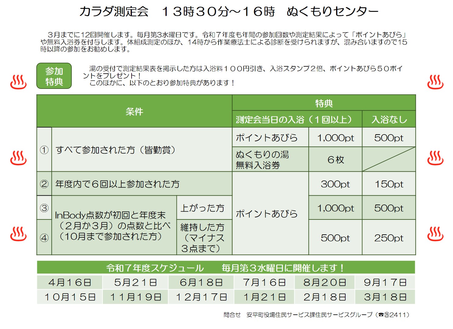 ●参加特典:測定会受付でポイントあびら50ポイント付与、湯の受付で測定結果表を掲示した方は入浴料100円引き(小人50円引き)、入浴スタンプ2倍!年間の参加回数や測定結果によって「ポイントあびら」のポイントや無料入浴券を付与します。